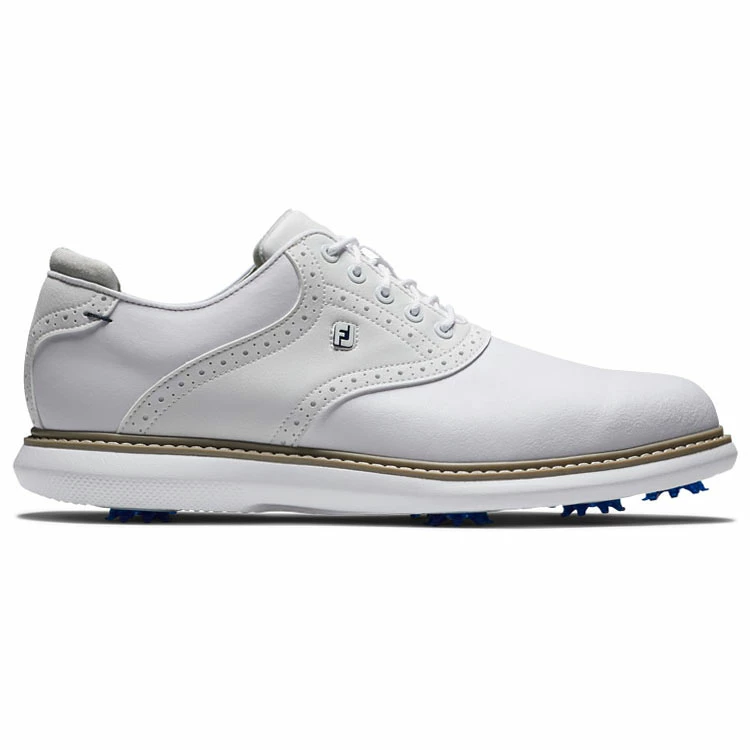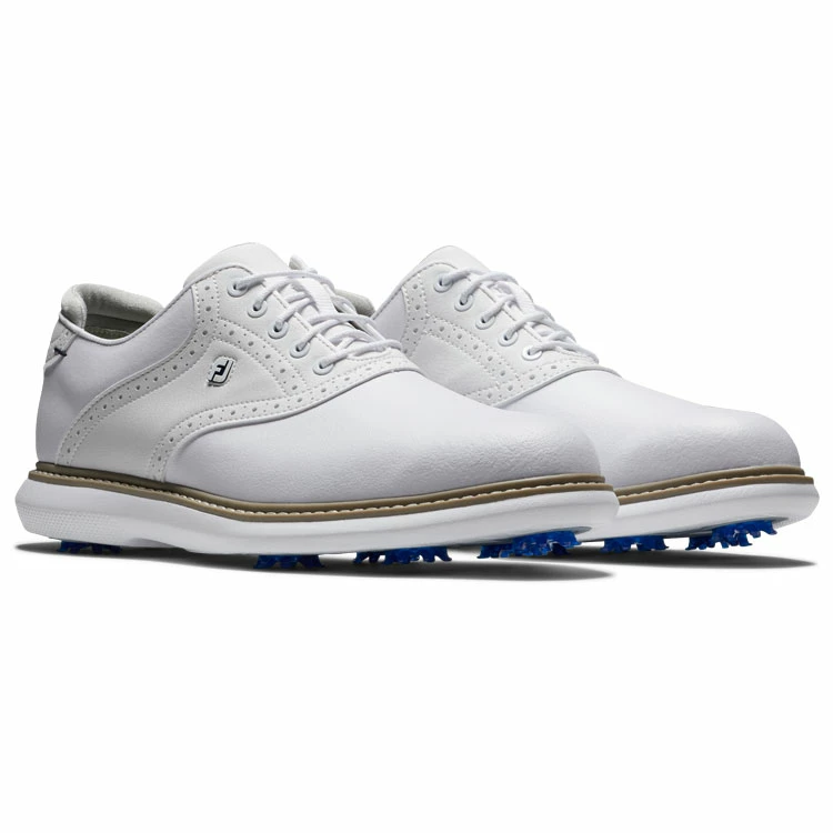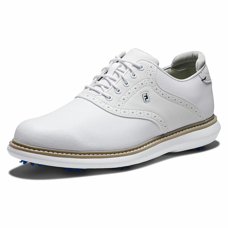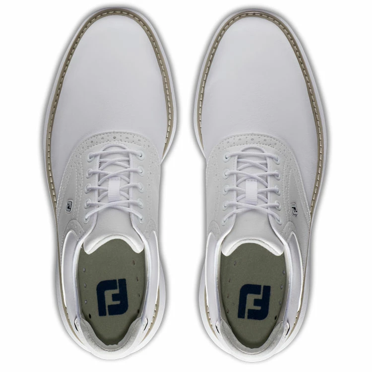 | FootJoy FJ Traditions 57903 Golf Shoes All Day Comfort In A Modern Classic Style FootJoy FJ Traditions offer complete traction and can be easily maintained round after round. Lightweight comfort and super-cushioned foam deliver an incredibly flexible and comfortable ride. The super-cushioned foam underfoot will keep you comfortable and supported throughout the entire round, and built in achilles pad ensures a perfect no-slip fit. 100% waterproof, a full grain leather provides a soft and easy to clean upper with 1 year waterproof protection. For traction, Pulsar LP cleats by Softspikes offer renewable grip on the course and the 7-cleat configuration provides a high level of traction points for even more grip. Clean and iconic, the FJ Traditions Golf Shoes offer the perfect blend of classic design with modern performance. |