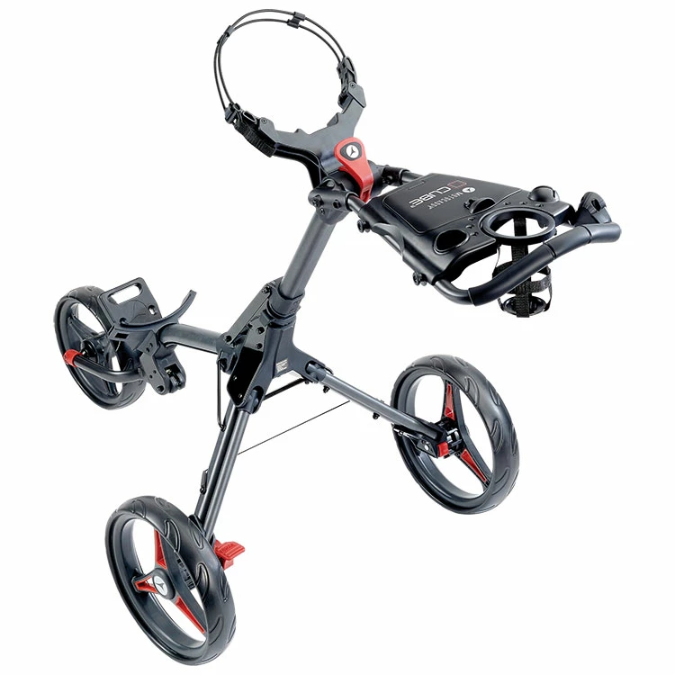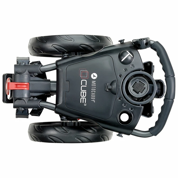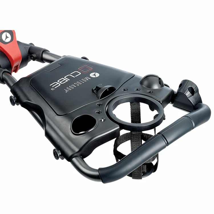 | Motocaddy Cube 3 Wheel Golf Trolley Space Conscious With Ultra Compact Size The newest addition to Motocaddy’s compact folding range, the CUBE push trolley incorporates an incredibly simple two-step assembly system that allows it to quickly fold over 45% smaller than traditional push trolleys to fit into the smallest of car boots. Offering an ergonomic handle with adjustable height control, the CUBE features a number of handy storage options, including an under-handle net; in-built drink holder; scorecard clip; accessory compartment; umbrella holder attachment; plus holes for balls and tees. Other features include easy-run oversize wheels, a foot-operated parking brake, adjustable bag supports and the popular EASILOCK bag-to-trolley connection system. |
