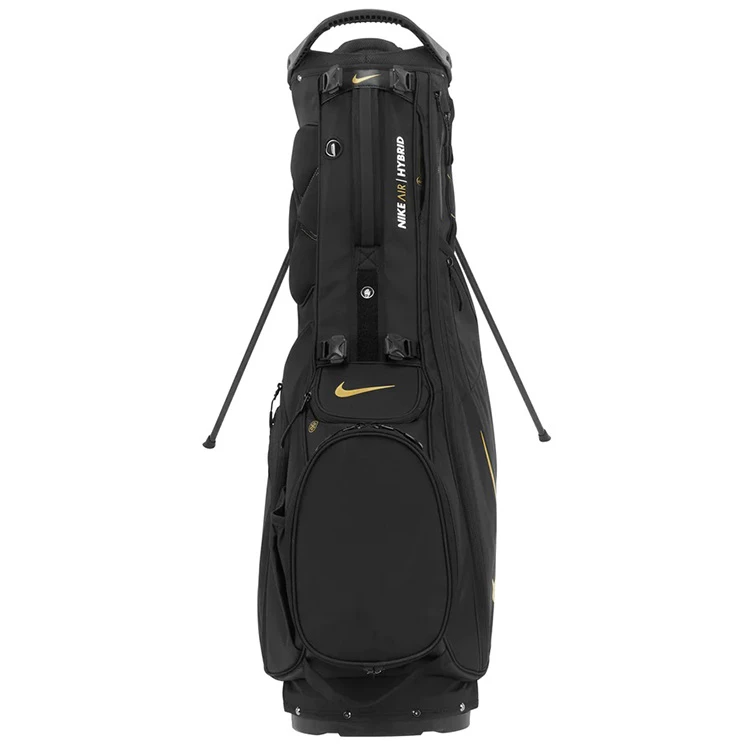 | Nike Air Hybrid 2 Golf Stand Bag Trolley Friendly Base With Hybrid Design The Nike Air Hybrid 2 Stand Bag is equipped with an EquaFlex Max Air double strap system for comfortable hauling, and 12 functional pockets help keep essential equipment organised on the course. Featuring a 14-way full length divider system for keeping your clubs in order and the Nike EquaFlex dual strap system with a ventilated air mesh back pad for extra comfort when carrying. A water resistant, fleece lined pocket protects your valuables, while an insulated cooler bottle pocket provides easy access storage for food and beverages, plus scorecard and pencil pockets to keep you organised. The Air Hybrid 2 is packed with premium features. With a cart friendly base, the Air Hybrid 2 now features utility webbing for convenience, new custom grip leg end caps for stability when standing and the matching rain hood is included for protection from the elements. |