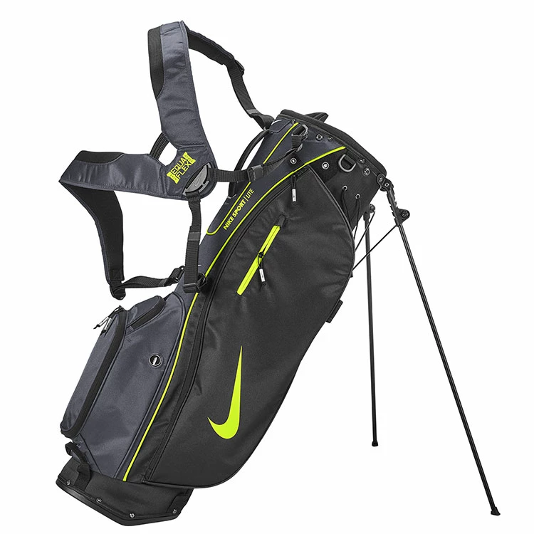 | Nike Sport Lite Golf Stand Bag Ultra Lightweight With Functional Storage The Nike Sport Lite Stand Bag is made with an ultra-lightweight, durable material with highly specialised compartments for easy carrying and premium organisation throughout a full 18 holes. Featuring a 5-way divider for keeping clubs in order and the Nike EquaFlex dual strap system for extra comfort for carrying. A water resistant, fleece lined pocket protects your valuables, while an exterior water bottle pocket provides easy access storage, plus scorecard and pencil pockets to keep you organised. The Nike Sport Lite is packed with best selling features. The Sport Lite now features new custom grip leg end caps for stability when standing and the matching rain hood is included for protection from the elements. |
