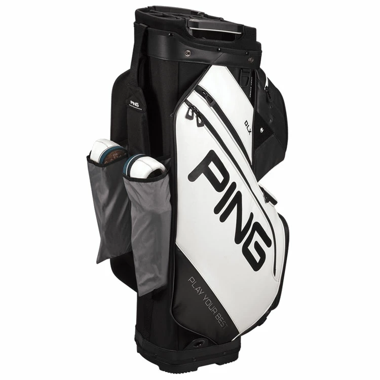 | Ping DLX Golf Cart Bag Ultimate Performer In A Premium Construction The Ping DLX bag offers premium look and performance. From it’s specially engineered 15-way Air Mesh top with large dividers, to its 14 pockets, and its newest feature: two deployable shoe pouches. Pockets range in size for storing range finders, beverages, apparel, tools, and more. A cart-strap channel keeps pockets accessible when the bag is strapped to a cart, and a heavy-duty polyurethane material provides long-lasting quality. The rubberized, cross-design bottom fits securely on motorized and pull carts. A premium golf bag, the DLX is a market leader for the true trolley player. |