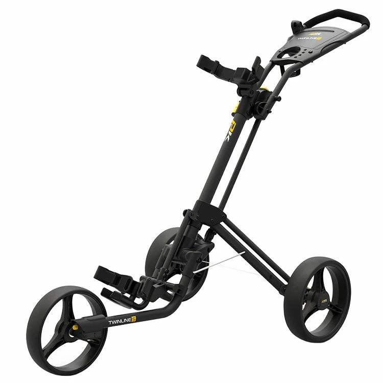 | PowaKaddy Twinline 5 Lite Golf Trolley Lightweight Design With Quick Fold System The PowaKaddy TwinLine 5 is a stylish lightweight push trolley that is very easy to set up, folds down extremely fast and compactly. Constructed from a lightweight aluminium frame and designed to glide over any terrain thanks to the large sports wheels. The ergonomic handle adjusts to suit your height and the PowaKaddy key lock system stops your golf bag from twisting. The compact 3-wheel design and wide wheelbase make pushing or pulling effortless whilst providing extra stability when going over uneven ground. Complete with an easily accessible footbrake to prevent the trolley from running away on inclines. |