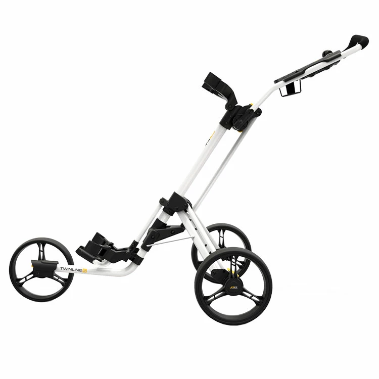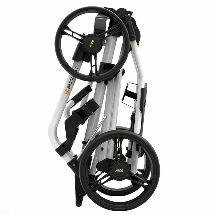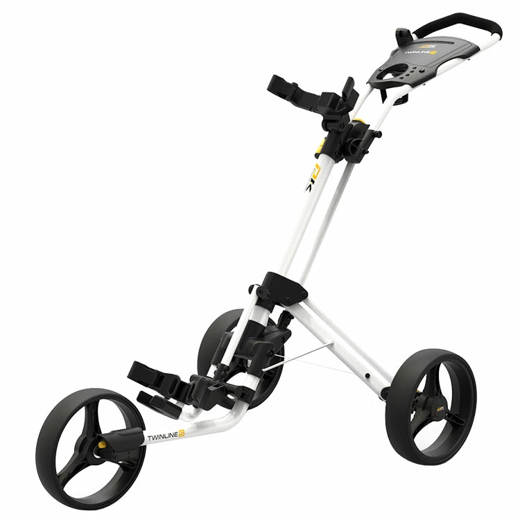 | PowaKaddy Twinline 5 Lite Golf Trolley Lightweight Design With Quick Fold System The PowaKaddy TwinLine 5 is a stylish lightweight push trolley that is very easy to set up, folds down extremely fast and compactly. Constructed from a lightweight aluminium frame and designed to glide over any terrain thanks to the large sports wheels. The ergonomic handle adjusts to suit your height and the PowaKaddy key lock system stops your golf bag from twisting. The compact 3-wheel design and wide wheelbase make pushing or pulling effortless whilst providing extra stability when going over uneven ground. Complete with an easily accessible footbrake to prevent the trolley from running away on inclines. |