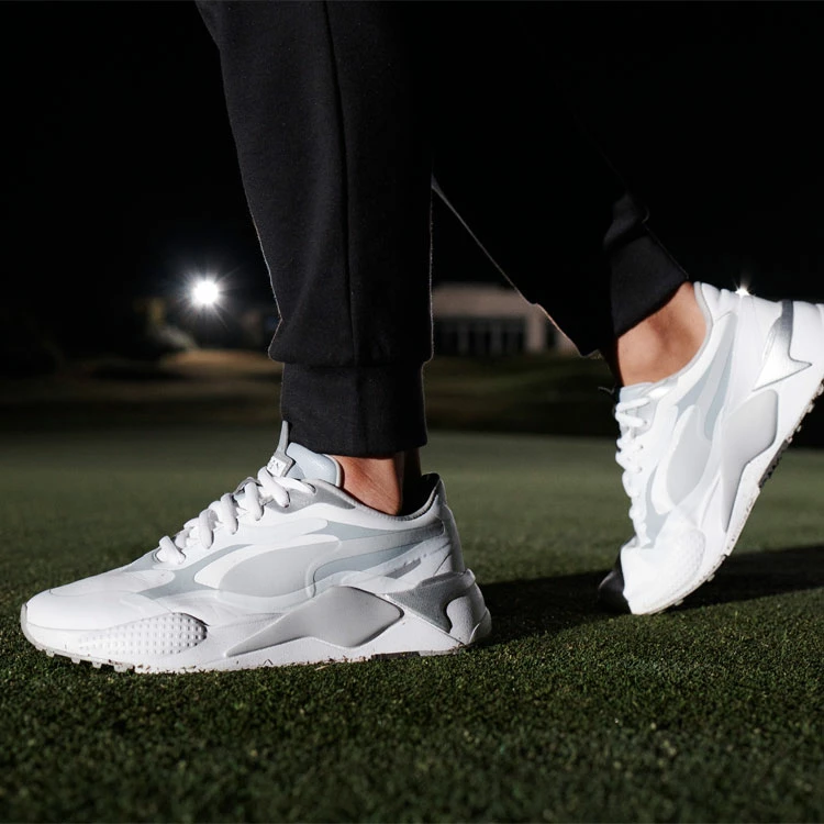 | Puma RS-G Golf Shoes Mixing 80s Retro With Sporting Innovations Puma Golf, long revered as a trend-setter and innovator in the golf footwear space, continues to push the envelope, with its new RS-G shoe. Inspired by Puma’s extremely popular RS series of shoes first introduced in the 80s and recently rebooted with multiple drops in 2019 and 2020, the RS-G delivers unconventional, lifestyle-inspired vibes with all the performance technologies needed to play 18. Incorporating the same, bold, chunky silhouette as the sportstyle version, the RS-Gs reengineered upper is seam-sealed and completely waterproof, with microfiber leather and TPU skin that delivers protection from the elements, keeping your feet dry all day long. The outsole traction pattern has exaggerated and pronounced Carbon Rubber lugs strategically placed in different zones of the outsole to provide traction while the performance Fusion Foam midsole delivers improved, bounce-back cushioning combined with a Softfoam sockliner for the ultimate step-in comfort. These stylish shoes bring retro running vibes to the links. Break tradition with the new Puma RS-G Golf Shoes. |