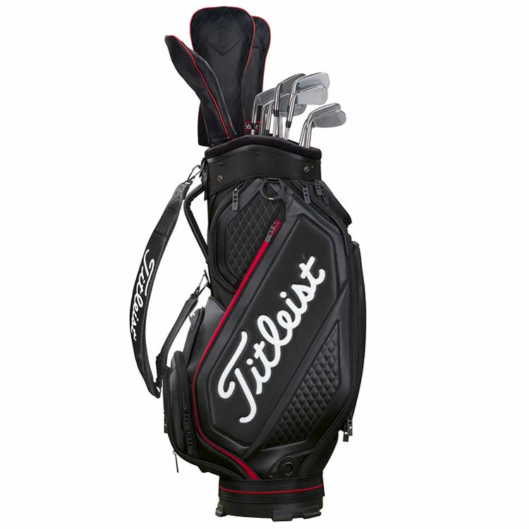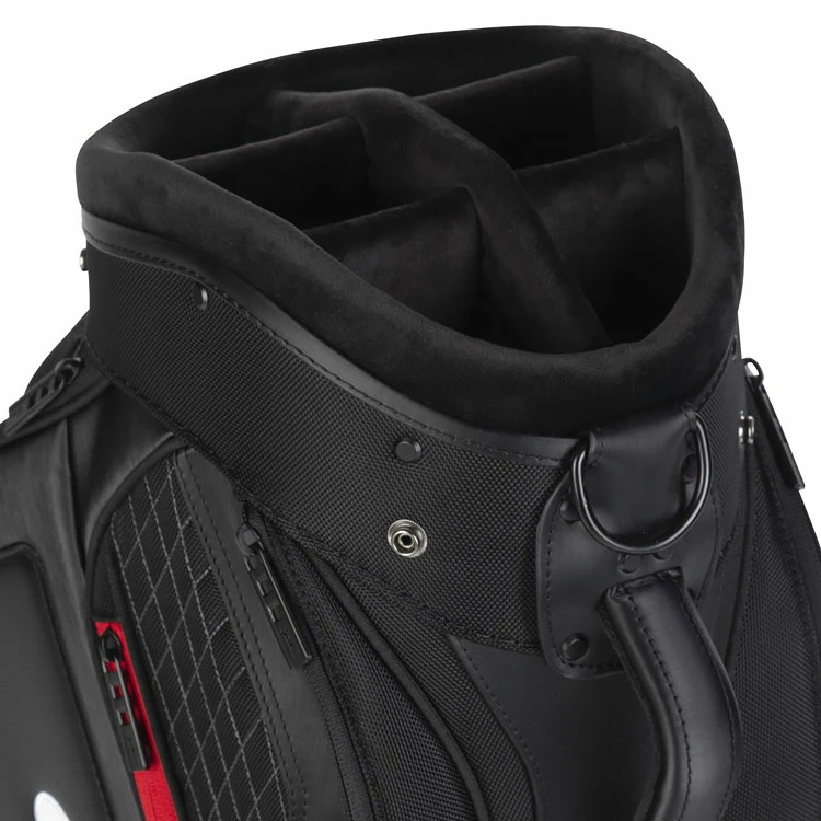 | Titleist Jet Black Midsize Staff Golf Cart Bag Tour Inspired Look With Luxurious Detailing A new introduction from Titleist, the Jet Black Midsize Staff Cart Bag is the ideal choice for the player looking for a cart bag with a staff tour bag look. Part of the new Jet Black Collection, the bag fits perfectly on a motorized trolley or with a push/pull trolley and features 11 zippered pockets that are all accessible while the golf bag is on the trolley. The molded base includes a trolley slot for extra stability during use. Other key features include a club & graphite friendly velour 6 way divider top which not only protects your clubs but gives exceptional organisation for the bag. With a two large apparel pockets, valuables pockets & more, the Titleist Jet Black Midsize Staff cart bag is the ultimate in tour bag looks for the trolley golfer. |