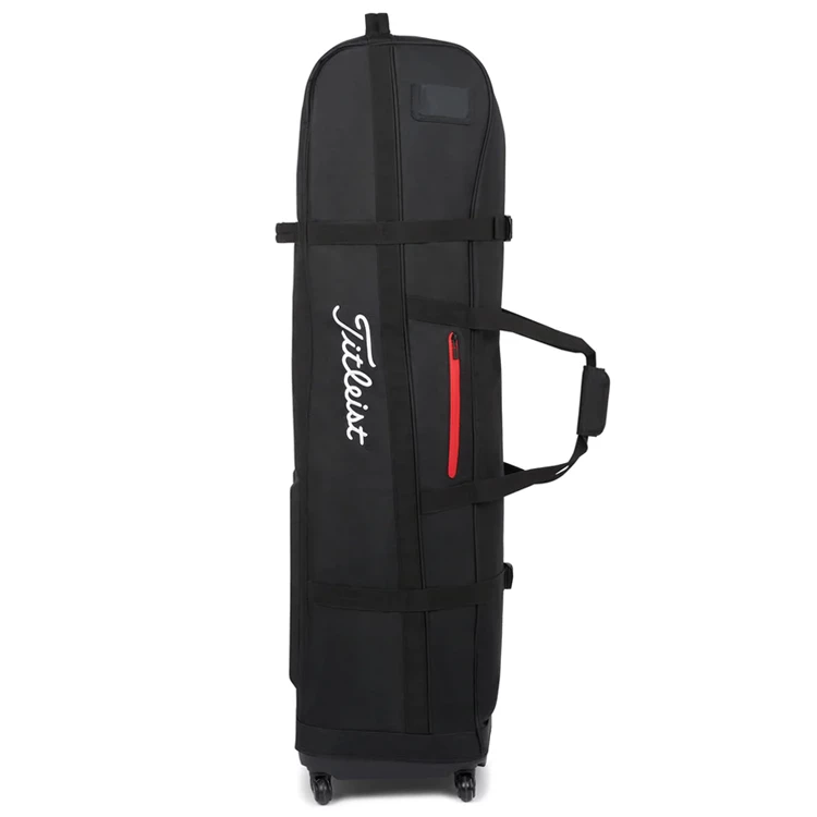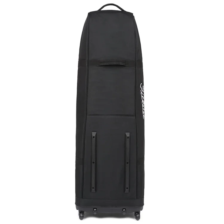 | Titleist Players Spinner Golf Travel Cover Maximum Padding With Spinner Wheel Design The Titleist Players Spinner Travel Cover has room to carry up to a 9.5” golf bag and also features additional internal pockets for golf shoes and internal padded straps to protect clubs during travel. A bestselling travel cover that protects your equipment and stores all your essentials for travel. – Large central zippered compartment with easy fold down entry – Internal padded straps to secure club heads for travel – Internal webbing to secure golf bag for travel – Valuables pocket – Two internal zippered pockets – Fully padded, 100% durable woven polyester with vinyl panel around bottom for increased durability – Waterproof material and zippers – Upright wheel system for excellent manoeuvrability |