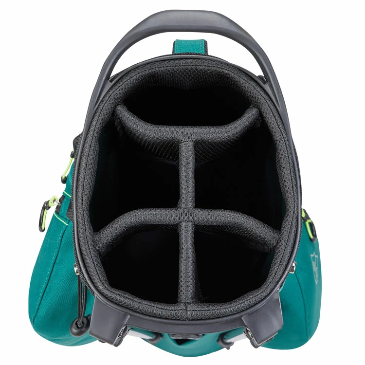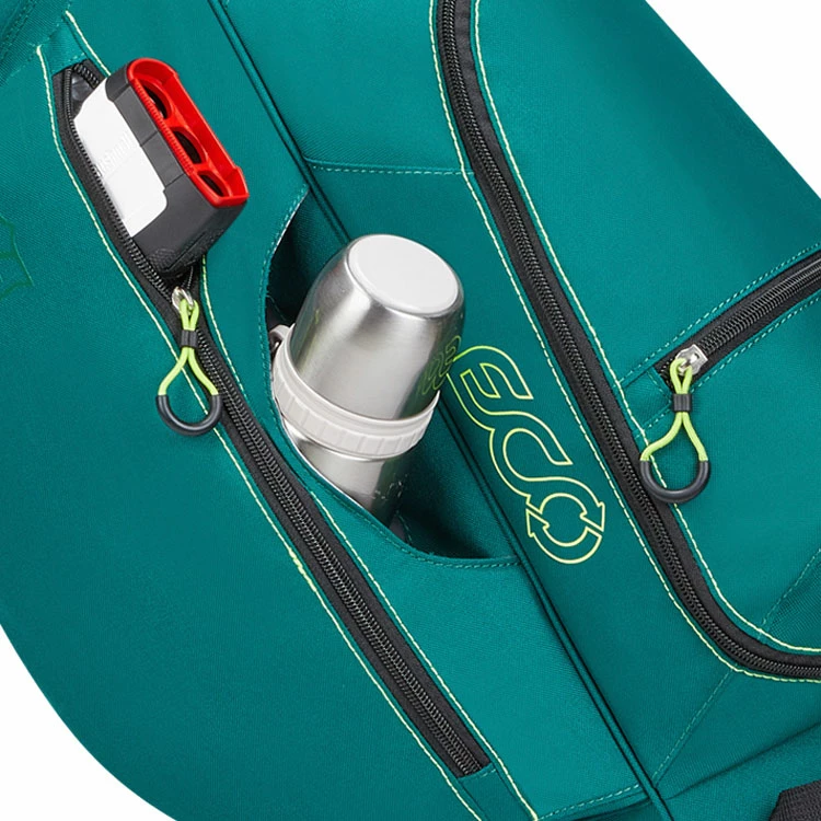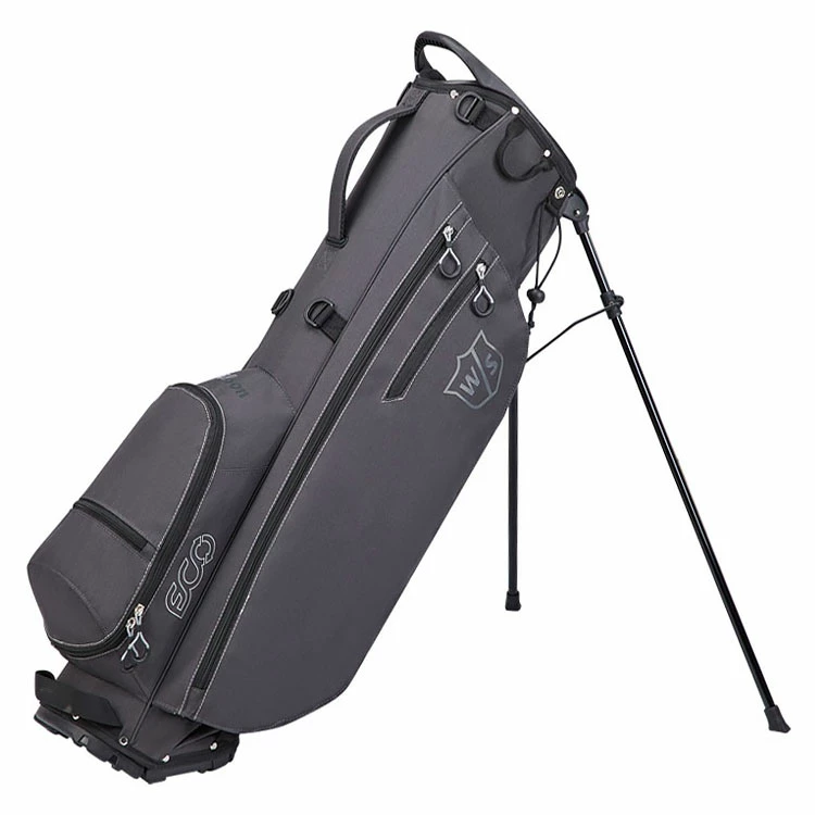 | Wilson ECO Golf Stand Bag Super Light Fabric With Eco Friendly Design The ECO bag has an environmentally friendly construction made from over 50 recycled plastic bottles. This bag material is made using less energy, a method that reduces CO2 emissions and importantly keeps more plastic away from landfill sites. A lightweight and functional bag weighing just 1.9kg, this bag caters to the ultimate walker demanding a comfortable feel and a quick activating stand. With great features such as 6 pockets for accessibility of belongings: one full-length garment, one valuables, one large ball pocket, two accessory and one open drinks pocket. Other features include a towel ring, umbrella loop attachment and rain hood. The bag has an automatic stand with a stay-flat base for extra stability when placed. |