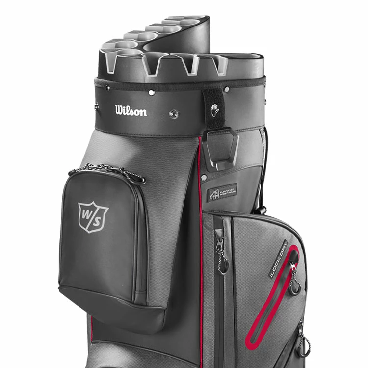 | Wilson iLock Dry Golf Cart Bag Spacious Size With Innovative Organised Top The new Wilson iLock Dry cart bag has a premium, modern design featuring the iLock top for the very best club organisation. The iLock Dry bag features a 14 way top locking divider with some full length dividers, enlarged putter section for thicker grips. There is a range of 7 pockets, including two valuables pocket to keep your belongings dry along with a large cooler pocket for your food and drinks. Fully seam-sealed and trolley base anchor, the iLock Dry Cart bag is a premium performer for the serious golfer looking for the best bag organisation. |